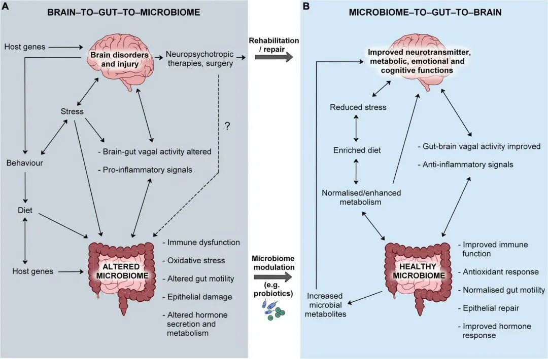 这篇综述最有价值的发现是:脑疾病往往是BGMA和MGBA失衡的结果!很多时候,不是肠道菌群失调导致了脑疾病,而是脑疾病先通过BGMA打乱了菌群,失调的菌群再通过MGBA加重脑疾病,形成恶性循环。