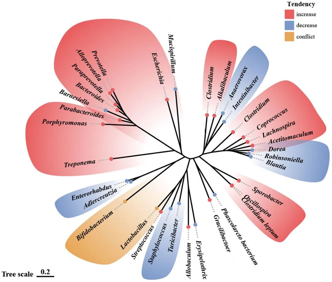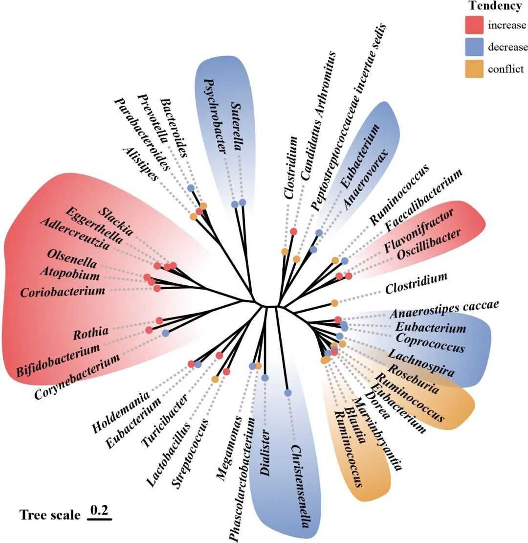 属水平:能产生短链脂肪酸(对身体有益的代谢物)的菌群,比如普拉梭菌(Faecalibacterium prausnitzii),在抑郁症患者中数量减少,且和抑郁症状严重程度呈负相关(数量越少,症状越重);而一些和炎症相关的菌群,比如双歧杆菌(Bifidobacterium)、罗斯氏菌(Roseburia),也和抑郁症密切相关。