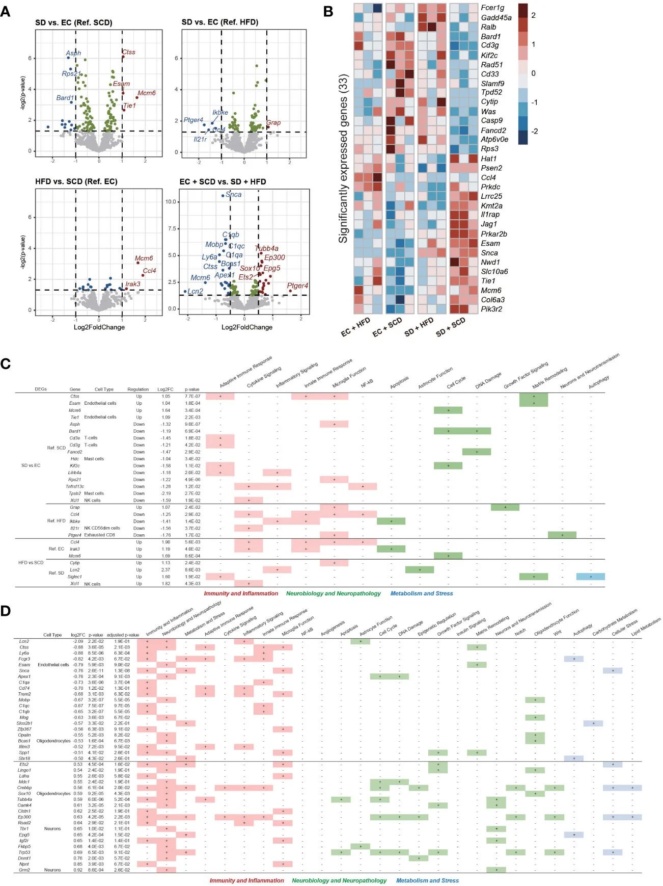 单独熬夜或单独吃高脂饮食,只会让少数和炎症相关的基因异常;但两者联手时,会有大量促炎基因(比如Cxcl10、Igf1、Cd70)疯狂“活跃”,大脑里的炎症标志物(Siglec1)也会大幅升高。